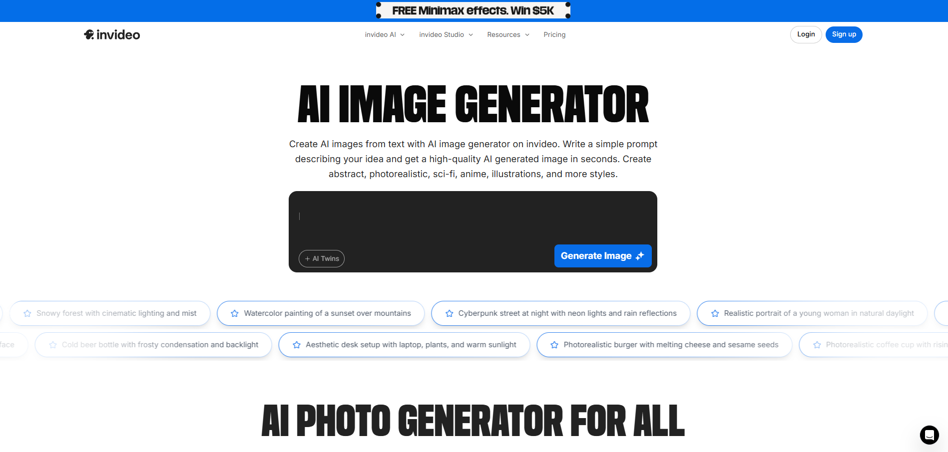 Invideo is a powerful platform that uses an AI Image Generator to turn simple text prompts into high-quality visuals for creative projects. It enables users to create images quickly, without needing any design experience, making it a convenient tool for creators looking to enhance their content efficiently. The platform provides fast generation and several creative features to support a smooth image-creation workflow.