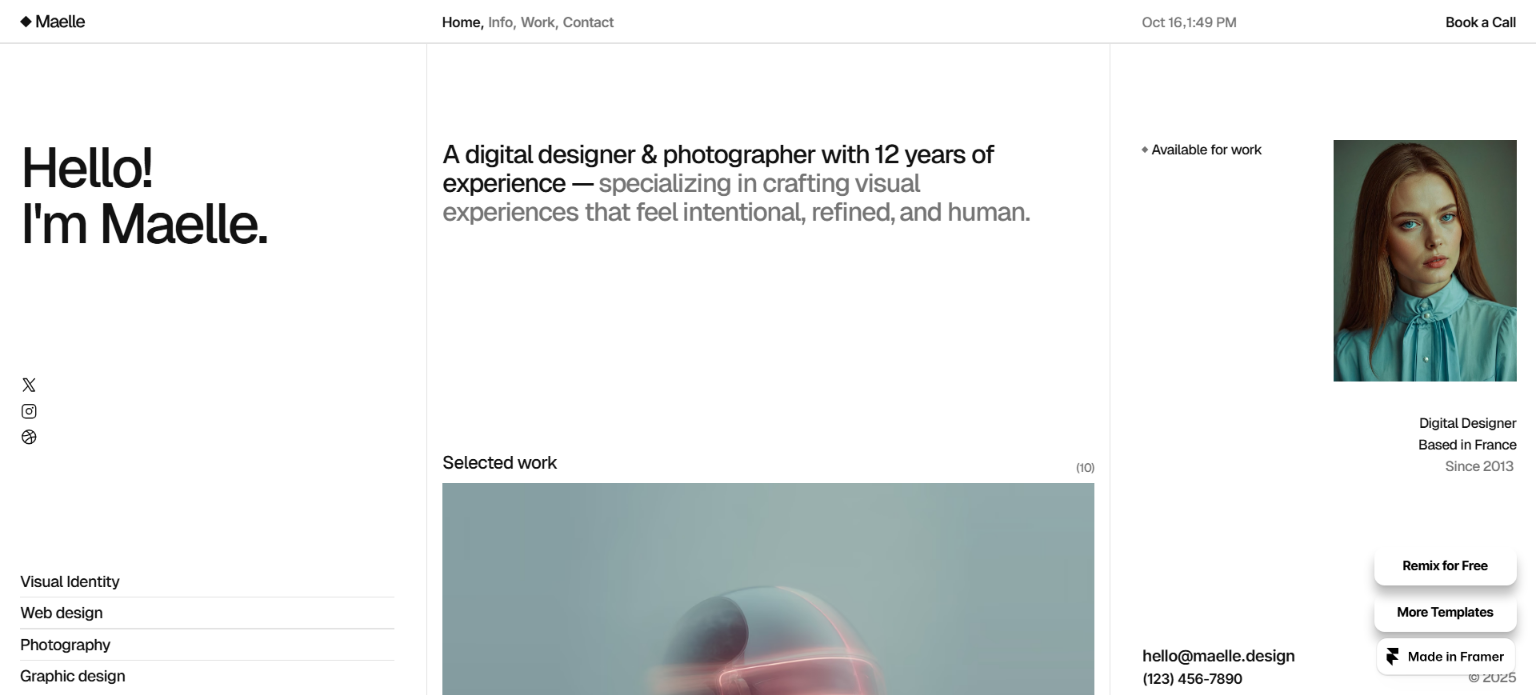 Ultra-minimalist with maximum impact. Features a sticky "Contact me" panel that keeps lead generation always visible. SEO-optimized and lightning-fast, this template is perfect for designers who want to turn visitors into clients effortlessly.