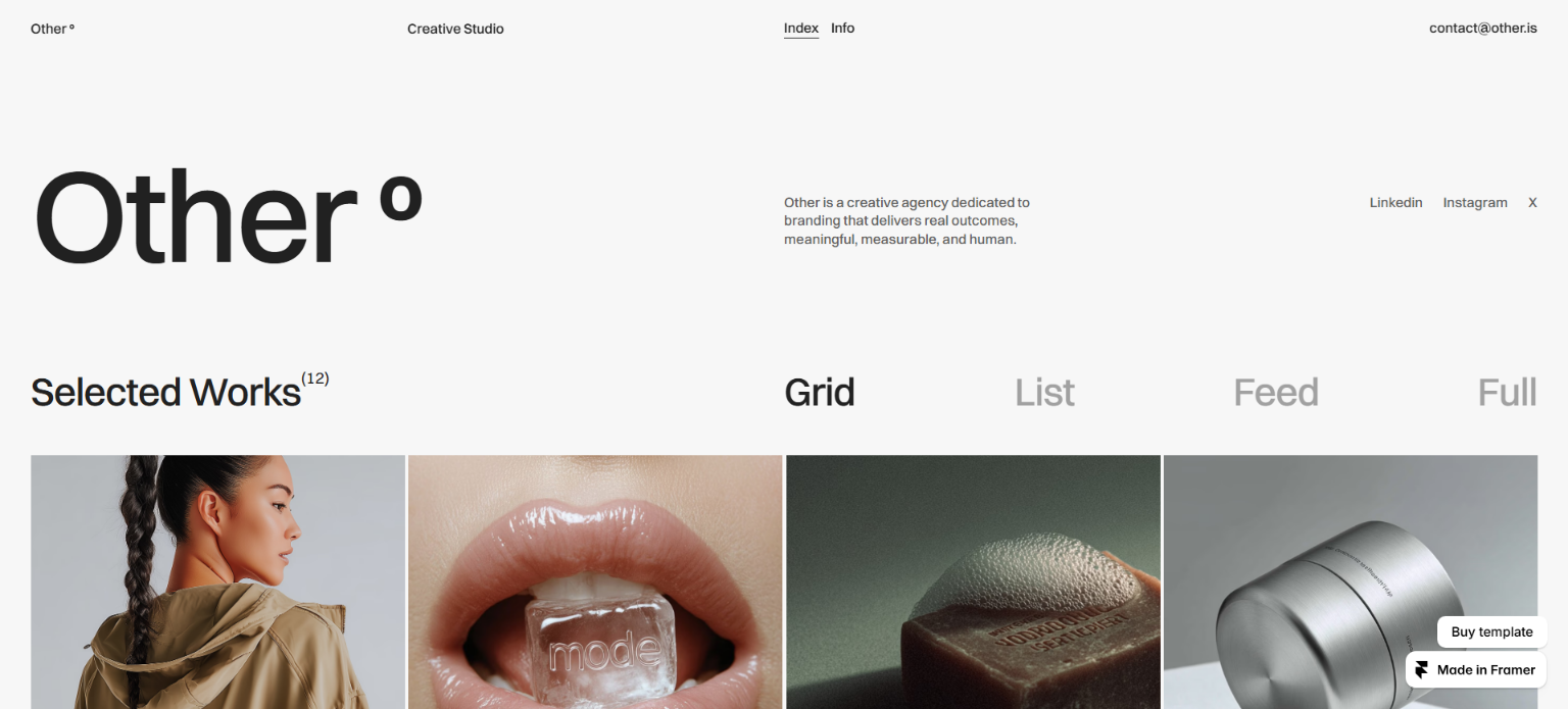 A fresh, minimalist portfolio that puts your work front and center. Switch between grid, list, feed, or full-image layouts to match your style. Perfect for creatives who want flexibility without sacrificing clean aesthetics.