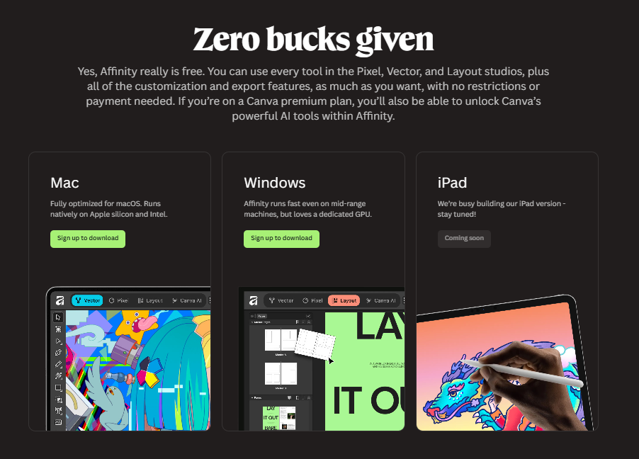 - Affinity is available for Windows, macOS (including Apple Silicon), and iPad (with mobile-specific interface).
