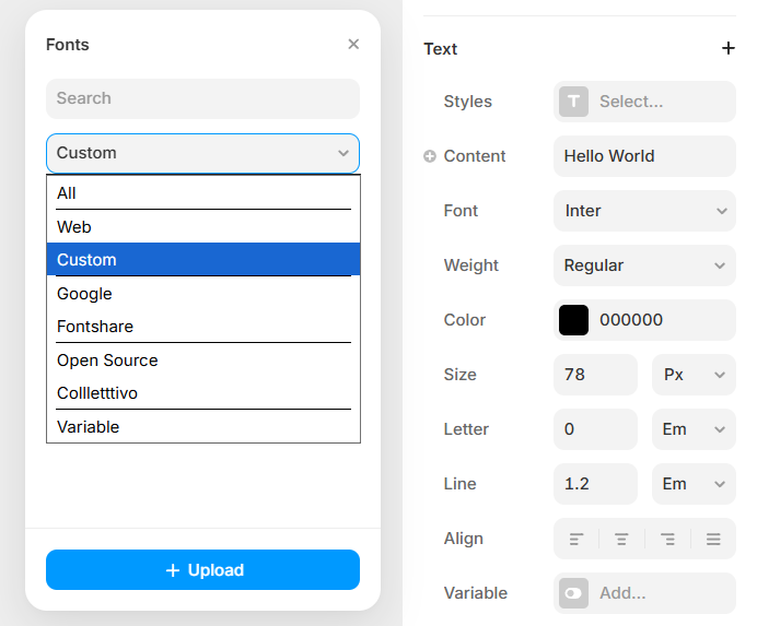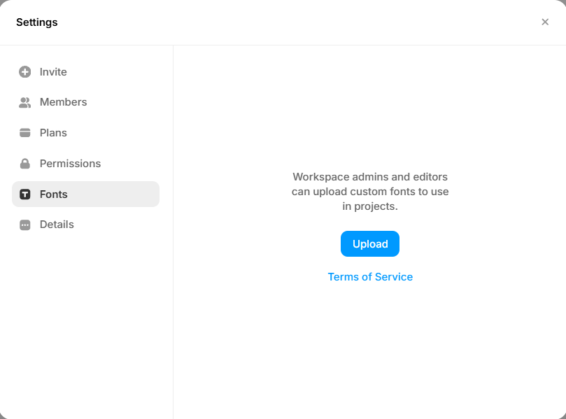For designers who want custom fonts available across all projects, Framer offers workspace-level font management.