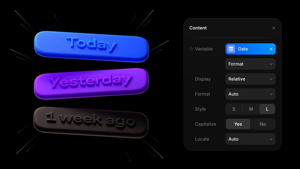 The feature supports additional formatting controls, including capitalization options and style presets such as Short, Medium, or Long, so teams can match their site’s voice and layout requirements. Relative Dates are fully compatible with localization, meaning phrases like “Today” or “1 week ago” will adapt to the site’s language settings and display correctly for different audiences. This localisation support is particularly important for Framer customers running multi‑language sites or serving international audiences where date phrasing and reading patterns vary.
